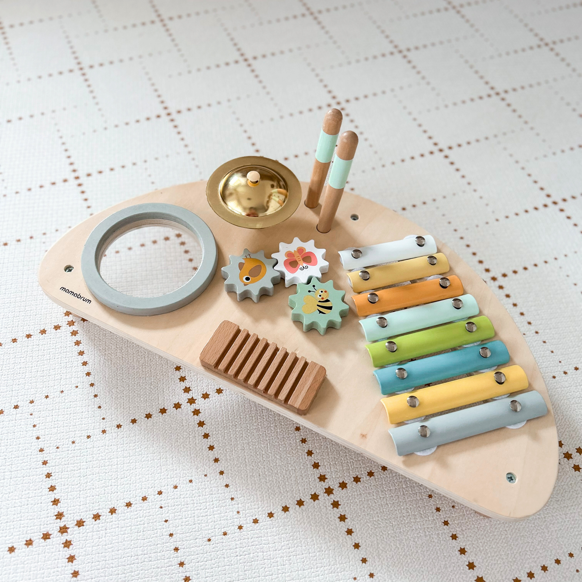 Das Musikzentrum aus Holz regt zum kreativen Spielen an. Enthält Mini-Trommeln mit Stöcken, Xylophon, rotierende Rädchen mit bunten Insekten und vieles mehr! Das Spielzeug bietet Kindern viel Unterhaltung und fördert gleichzeitig das Erlernen neuer Fähigkeiten, die Auge-Hand-Koordination und die manuelle Geschicklichkeit. Es ermöglicht Kleinkindern, in die Rolle eines Musikvirtuosen zu schlüpfen. Vielleicht weckt es eine neue Leidenschaft in Ihrem Kind!