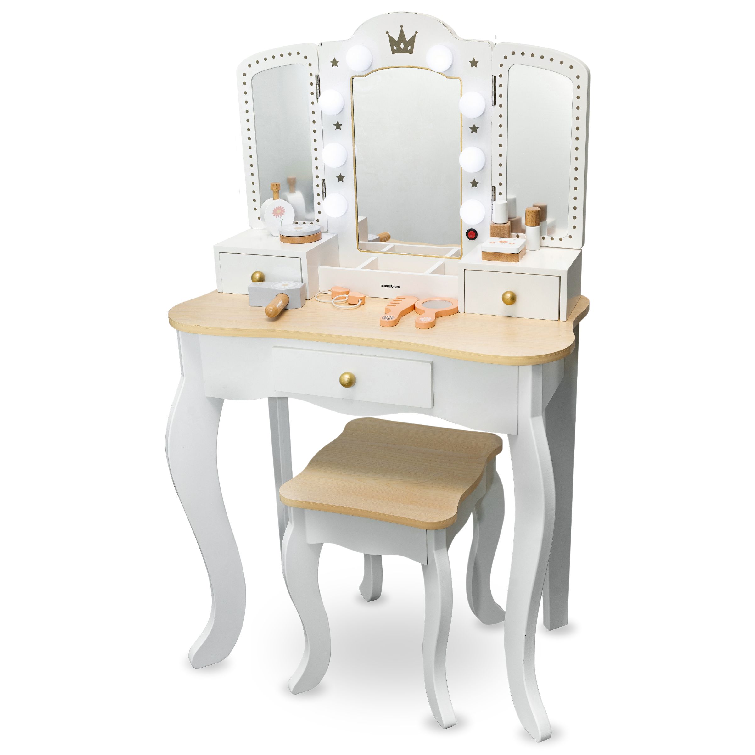 Stimmungsvolle, sanfte Beleuchtung durch 8 LED-Lampen. Der Spiegel ist abnehmbar und verwandelt den Schminktisch in einen kleinen Schreibtisch. Um das Gesicht aus einem anderen Winkel zu sehen, werden die Seitenspiegel einfach verstellt. Der Schminktisch aus Holz ist eine einzigartige Geschenkidee für Ihre Kleinen!