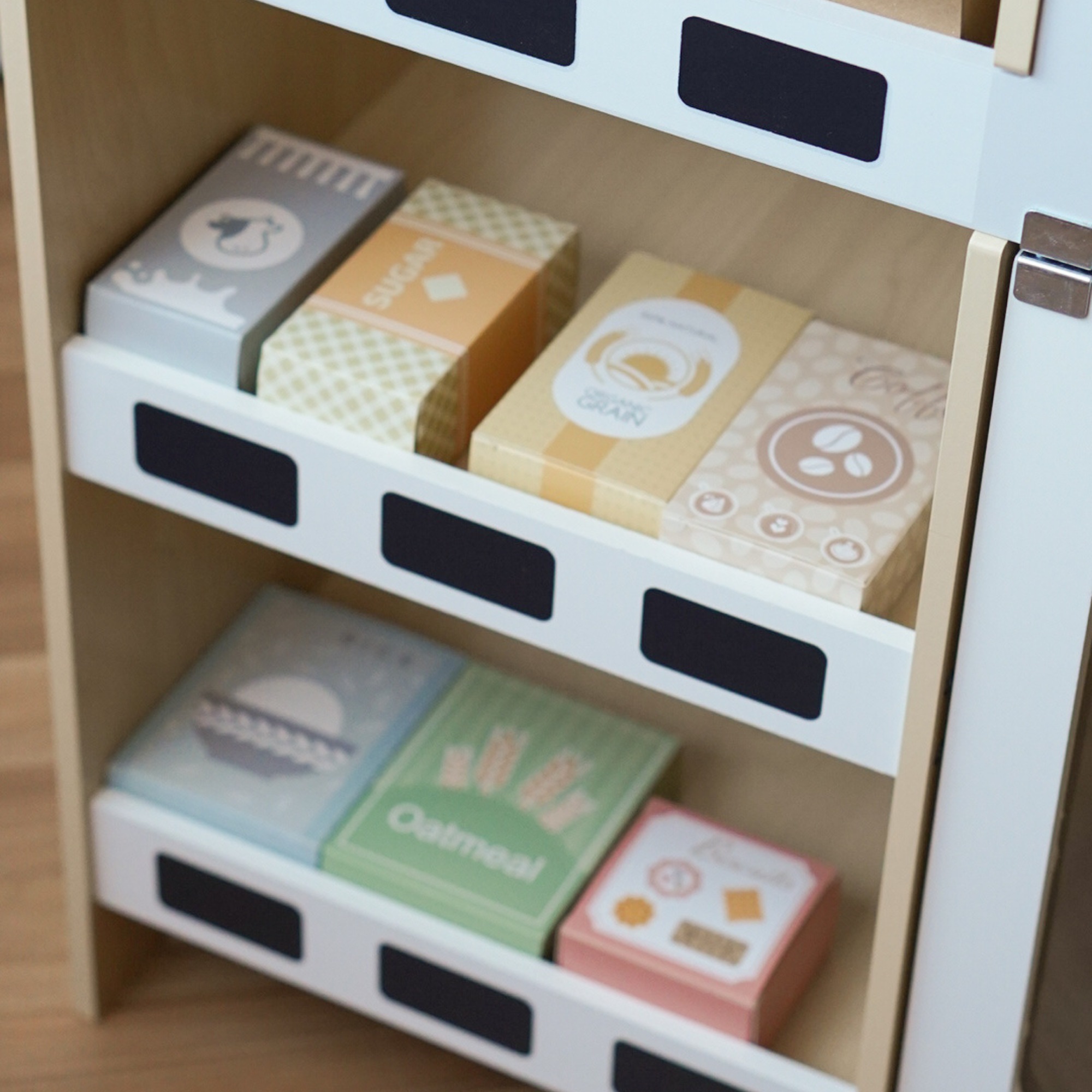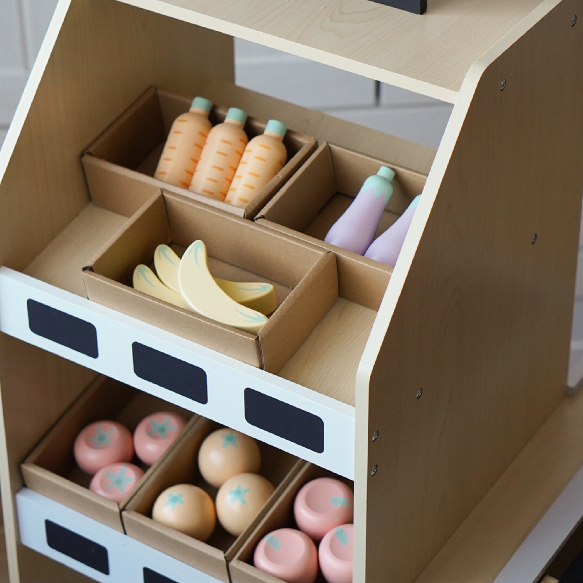 Zahlreiche Regale zum Ausstellen der Waren ermöglichen es dem kleinen Ladenbesitzer, die Produkte zu sortieren und bequem anzuordnen. Dank des stabilen Ständers und der umfangreichen Ausstattung des Holzstandes kann Ihr Kind in die Rolle des Ladenbesitzers oder Kunden schlüpfen und für einzigartige, kreative Unterhaltung sorgen.