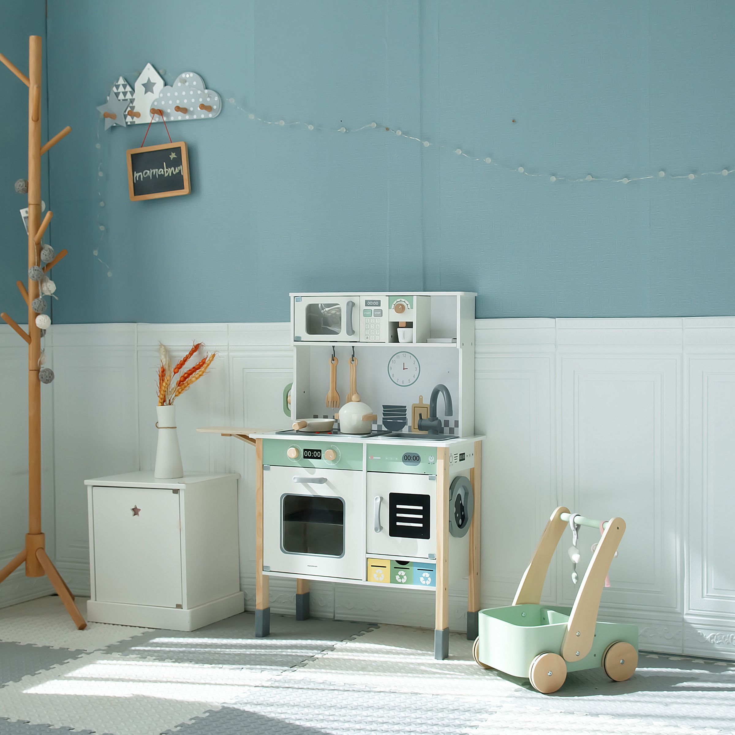 Die Holzküche mit Waschmaschine und Geschirrspüler lässt die Kinder die Freude an der Hausarbeit erleben. Kleinkinder können die Rolle der fürsorglichen Eltern zu Hause übernehmen, was ihre Unabhängigkeit und ihr Selbstvertrauen stärkt. Das ist ein Rezept für spannende Unterhaltung, nicht nur allein, sondern auch mit Gleichaltrigen.