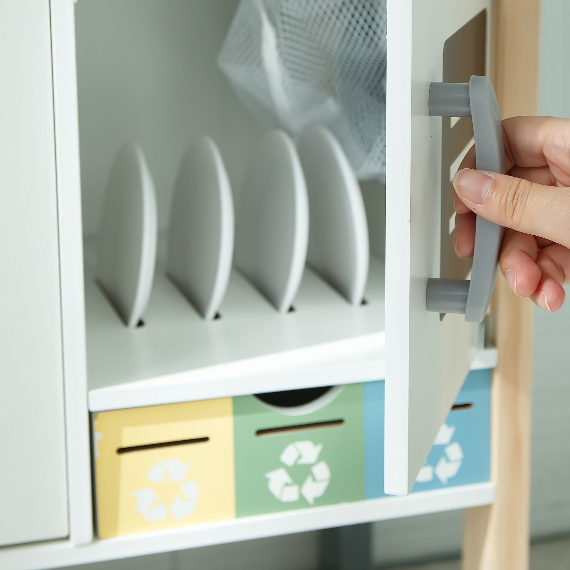 Die Kinderküche aus Holz ist nicht nur mit einem Geschirrspüler und einer Waschmaschine ausgestattet, sondern auch mit einem Mülleimer mit Sortiermöglichkeit. An der Rückwand befindet sich eine Kreidetafel, auf der die Kinder Speisekarten oder Rezepte aufschreiben können. Ein Bügelbrett mit Bügeleisen, eine Mikrowelle, eine Spüle und eine Kaffeemaschine runden die Ausstattung ab. Sie können sicher sein, dass sich Ihre Kleinen nicht langweilen werden!