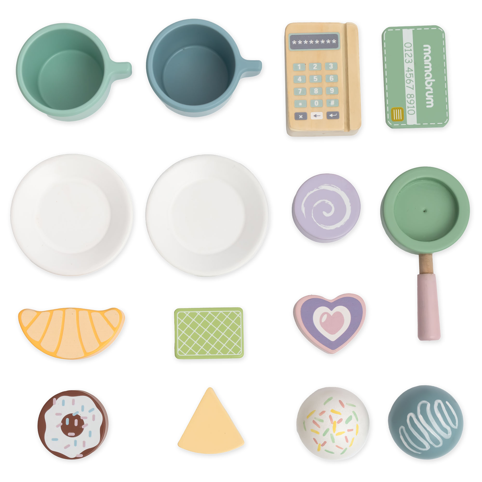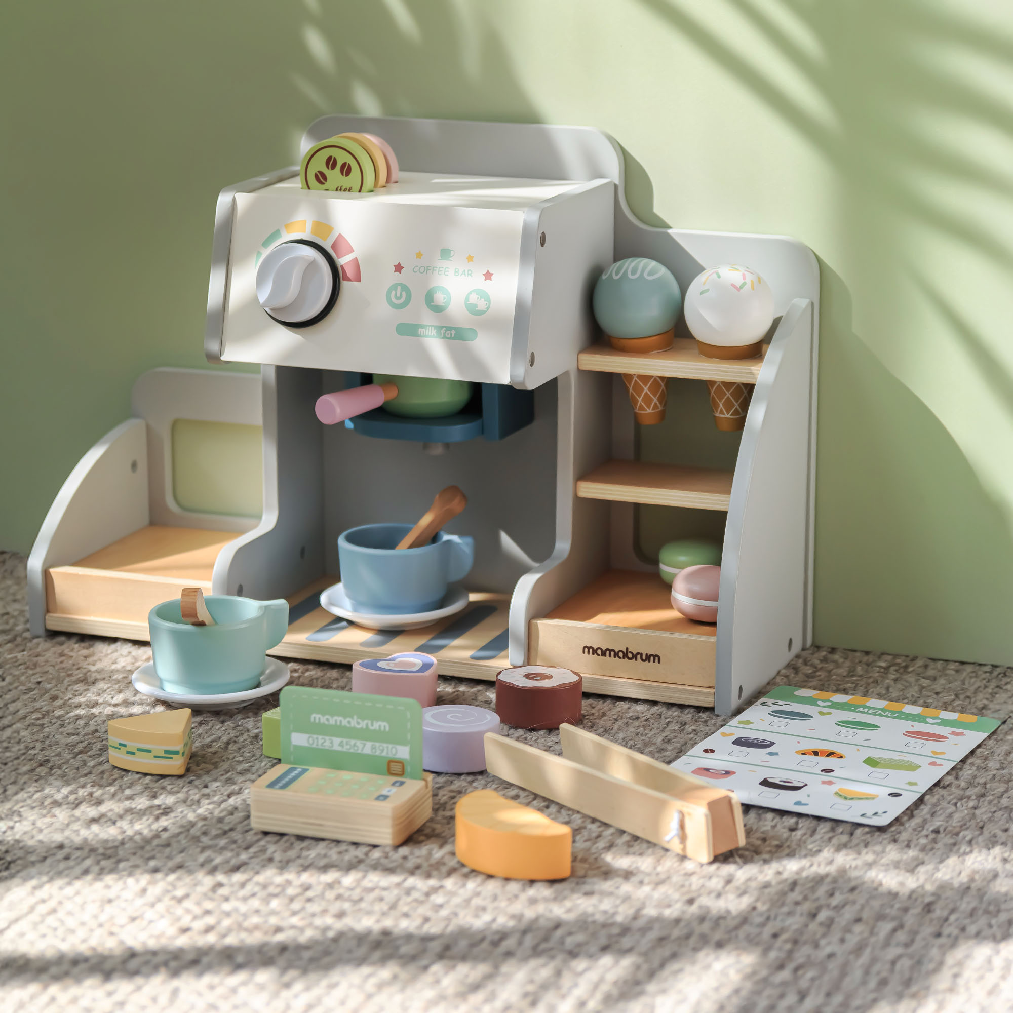 Dieses schön gestaltete Holzset entführt Ihr Kind in eine Welt voller aromatischer Getränke und süßer Leckereien! Ihr Kind kann Kaffee zubereiten, Eis servieren und kassieren - und das Ganze dann in einem neuen Spielszenario wiederholen. Mit dem umfangreichen Zubehör lassen sich eigene Menüs zusammenstellen und stundenlange Rollenspiele veranstalten. Das Spielen als Barista fördert die Kreativität und die Geschicklichkeit der kleinen Hände.