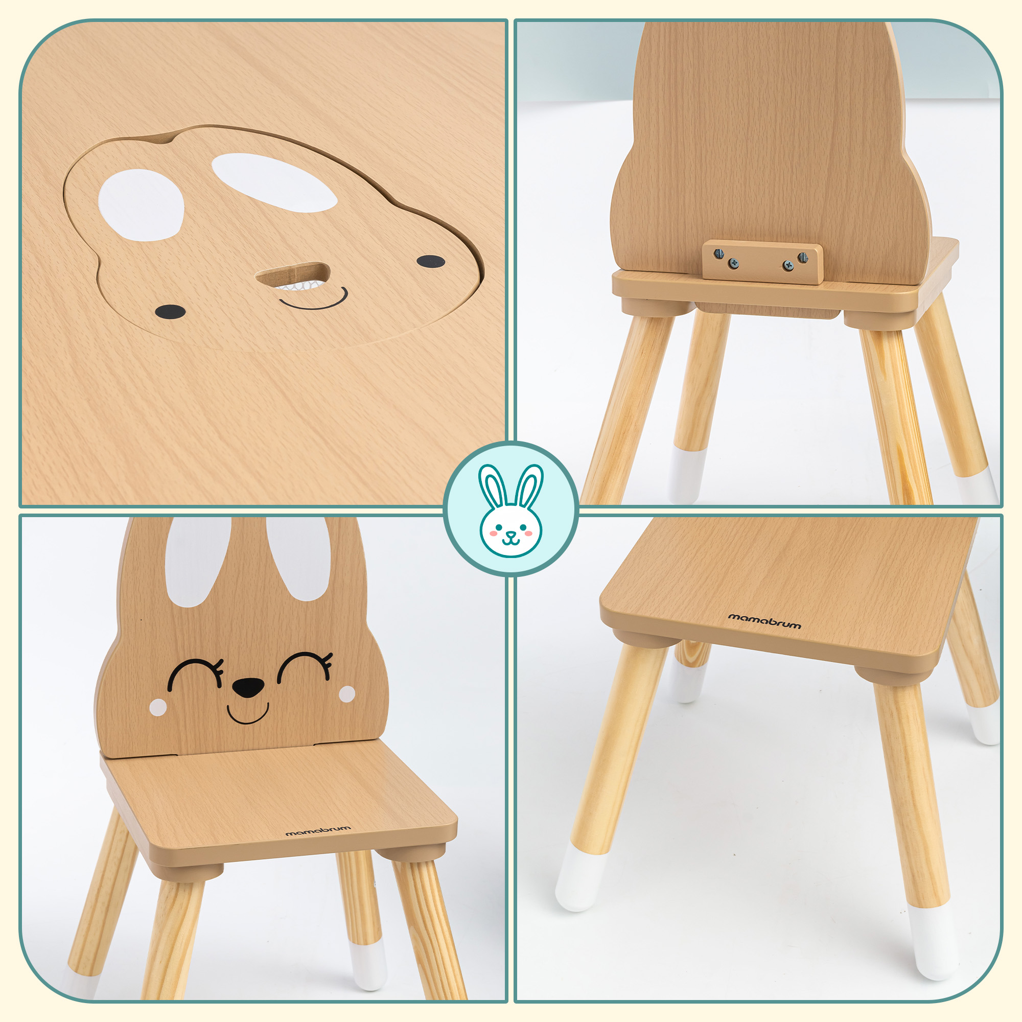 - Entzückendes Hasen-Design – Stuhllehnen in Ohrenform und eine Tischplatte mit einem Hasenbild