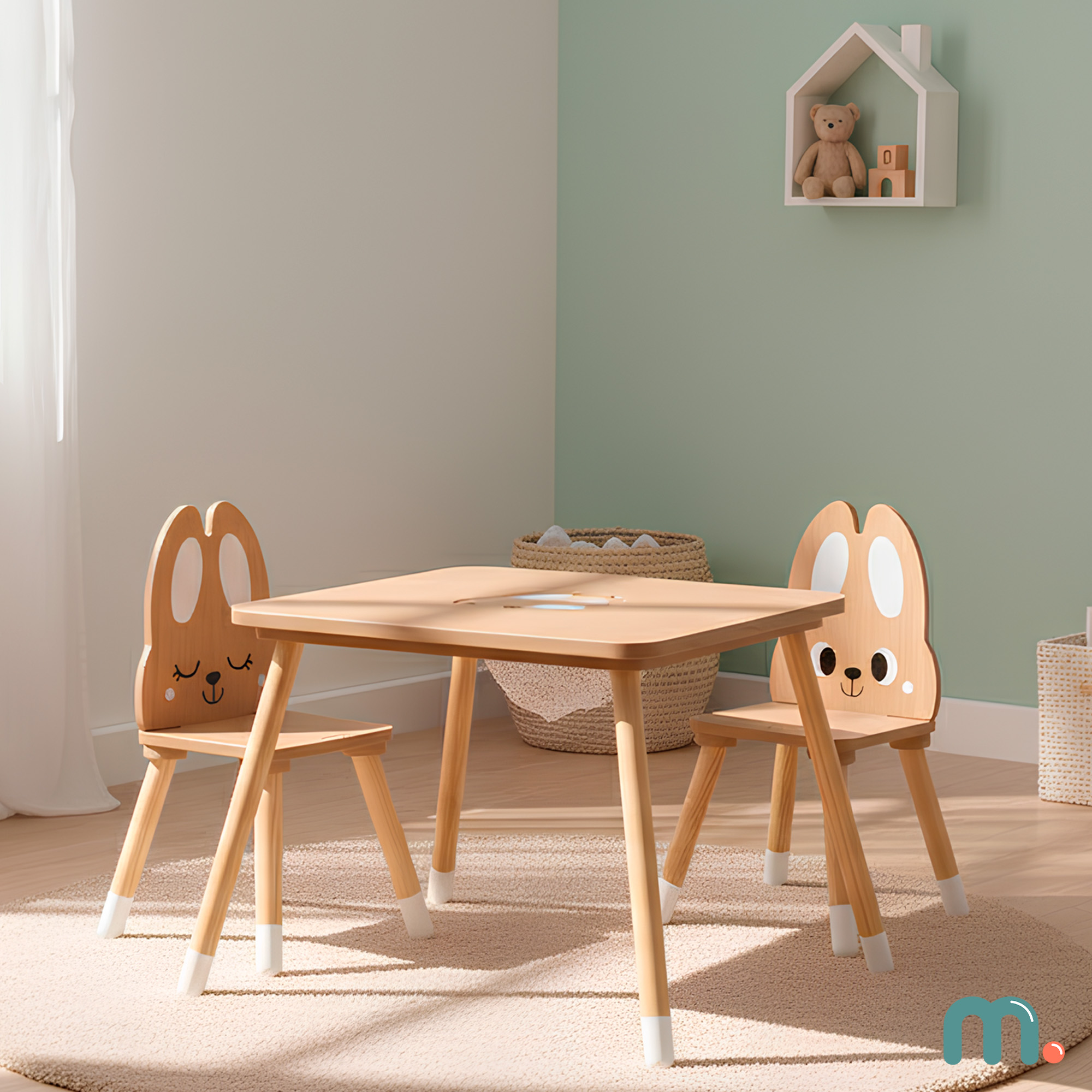 Schaffen Sie einen einladenden Raum für Ihr Kind, in dem jeder Tag zu einem neuen Abenteuer wird! Das bezaubernde Tisch- und Stuhlset „Kaninchen“ vereint einzigartiges Design, Funktionalität und solide Verarbeitung . Ein Holztisch mit Stauraum in der Mitte und zwei Stühle in Kaninchenform schaffen den perfekten Ort zum gemeinsamen Malen, Lernen, Essen oder Spielen.