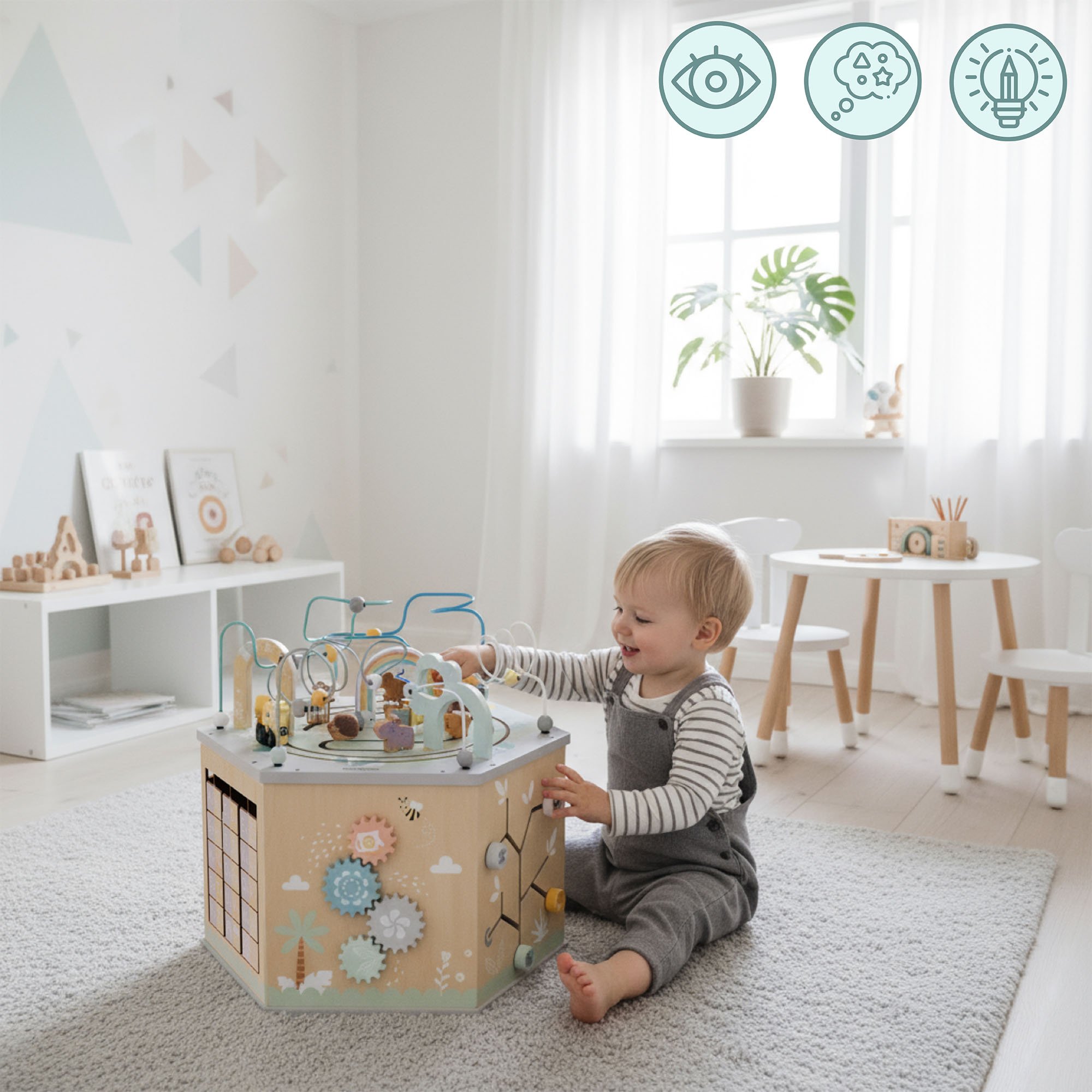 Alle Eltern träumen von einem Moment der Ruhe, in dem ihr Kleines vertieft spielt und gleichzeitig seine Fähigkeiten entwickelt. Dieser multifunktionale Lernwürfel wurde genau für solche Momente entwickelt. Dank seiner Vielseitigkeit kann er ein Kind stundenlang beschäftigen – er fesselt seine Aufmerksamkeit, regt seine Fantasie an und ermöglicht es ihm, seine manuellen Fähigkeiten und seine Konzentration zu üben. Während ihr Kleines freudig neue Aktivitäten entdeckt, können Eltern sicher sein, dass diese Zeit sinnvoll und sicher verbracht wird. Er ist nicht nur ein Spielzeug, sondern auch ein Werkzeug, das die tägliche Entwicklung ihres Kindes unterstützt und Frieden in das Familienleben bringt.