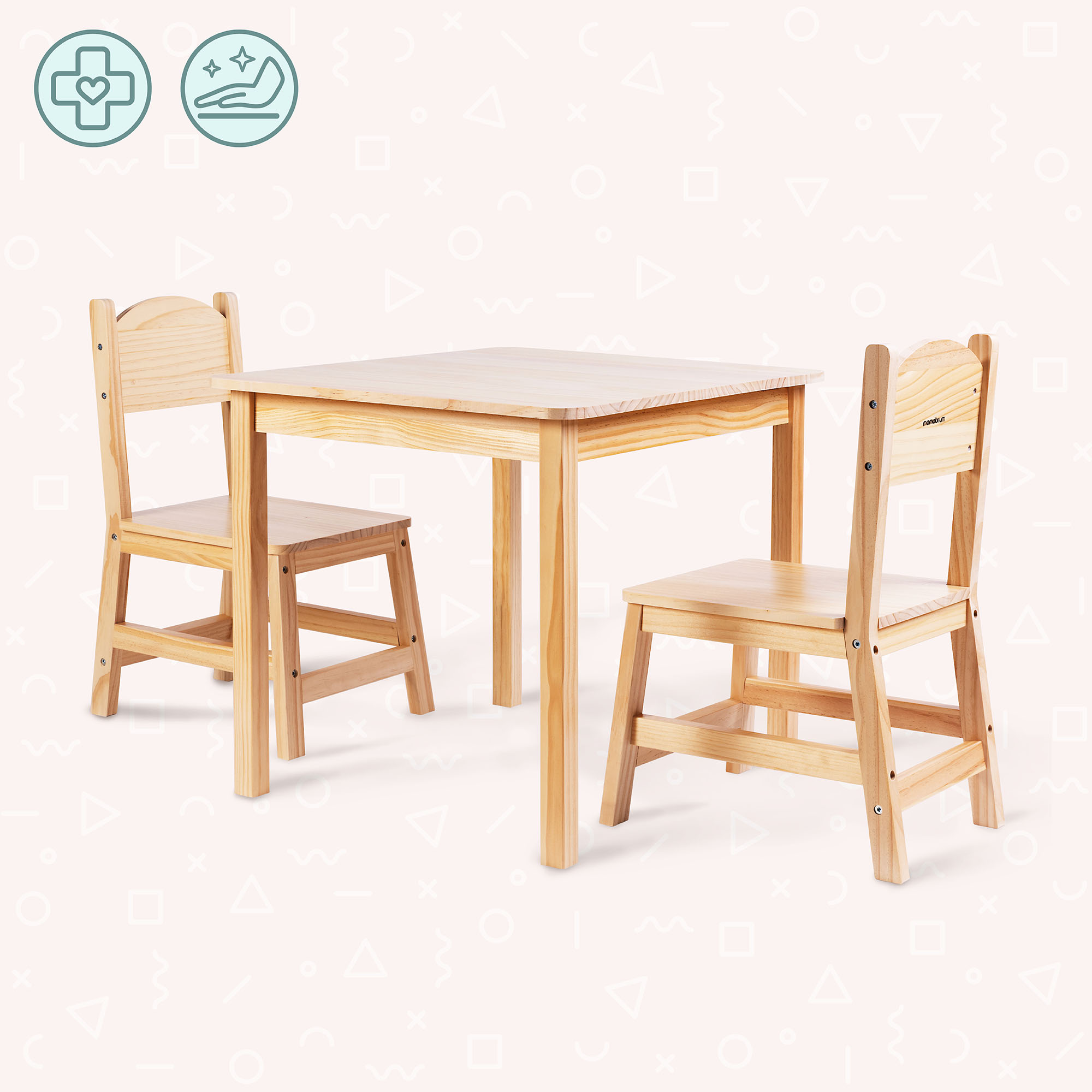 Geben Sie Ihrem Kind seinen eigenen Raum! – sicher, bequem und voller Möglichkeiten. Dieses Holzset mit einem Tisch und zwei Stühlen schafft den perfekten Ort zum Malen, Puzzeln, Lernen, Essen oder Spielen mit Geschwistern und Freunden. Natürliches Kiefernholz, eine ergonomische Form und die solide Konstruktion machen diese Möbel zur perfekten Ergänzung für Kinderzimmer, Wohnzimmer oder Spielbereich.