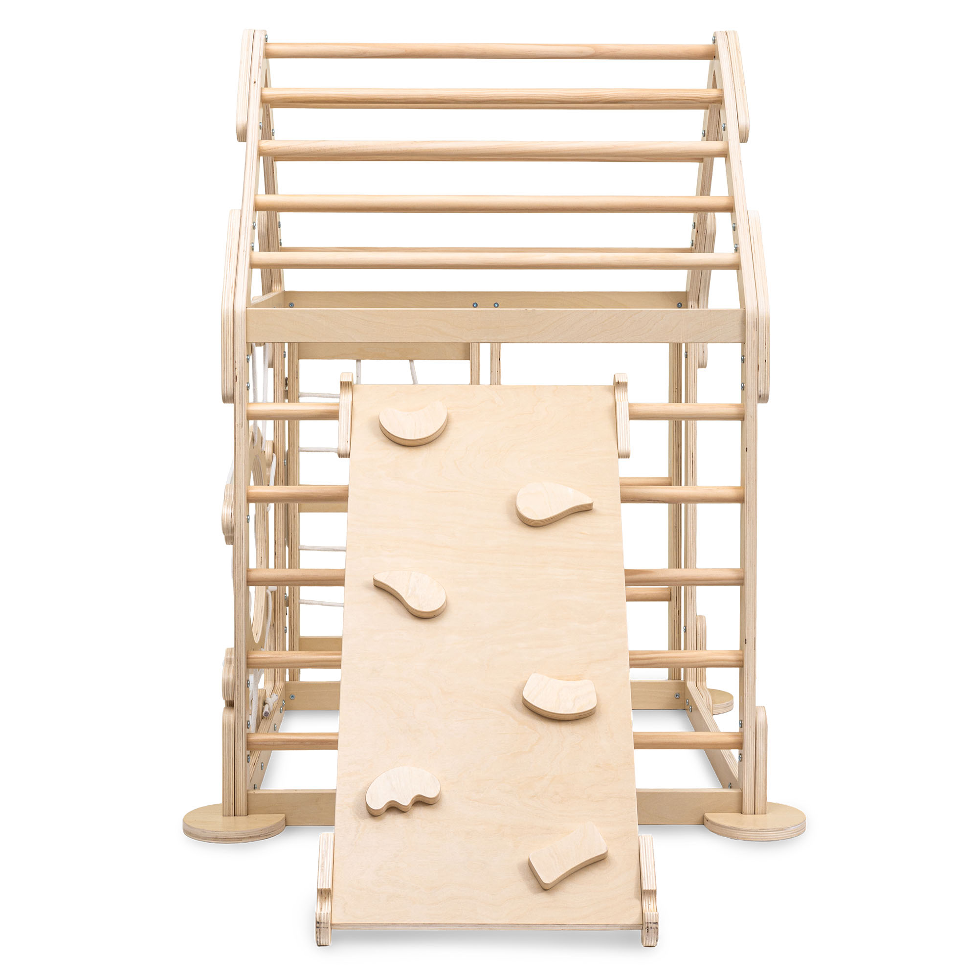 Schenken Sie Ihrem Kind einen echten Spielplatz ... direkt in seinem eigenen Zimmer! Das Mamabrum Holzkletterhaus kombiniert eine Turnleiter, eine Kletterwand, ein Netz, eine runde Kletteröffnung und ein Kletterdach. Seine Vielseitigkeit macht es zu einem Aktivitätszentrum, das Bewegung fördert, die körperliche Fitness verbessert und stundenlangen Spaß bietet.