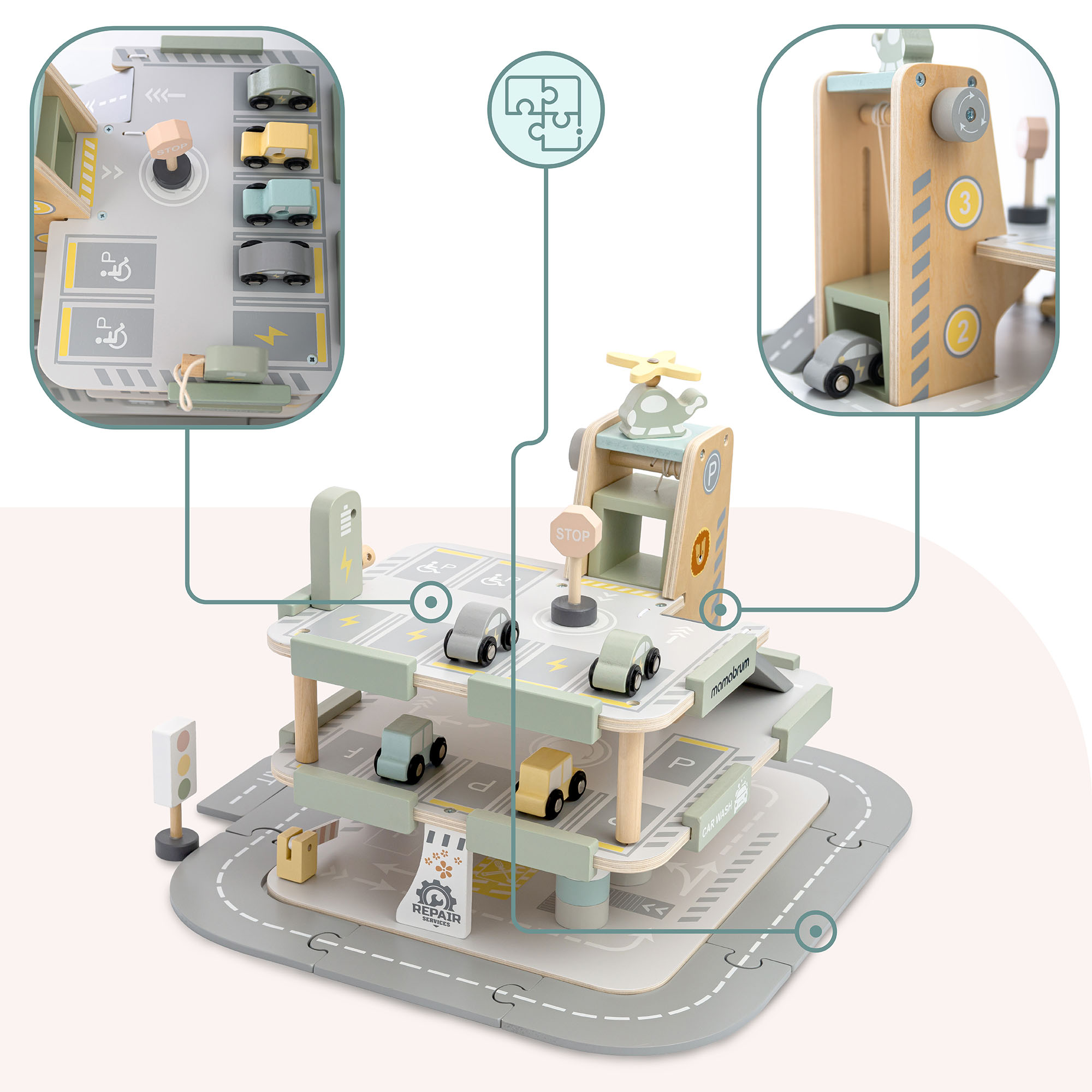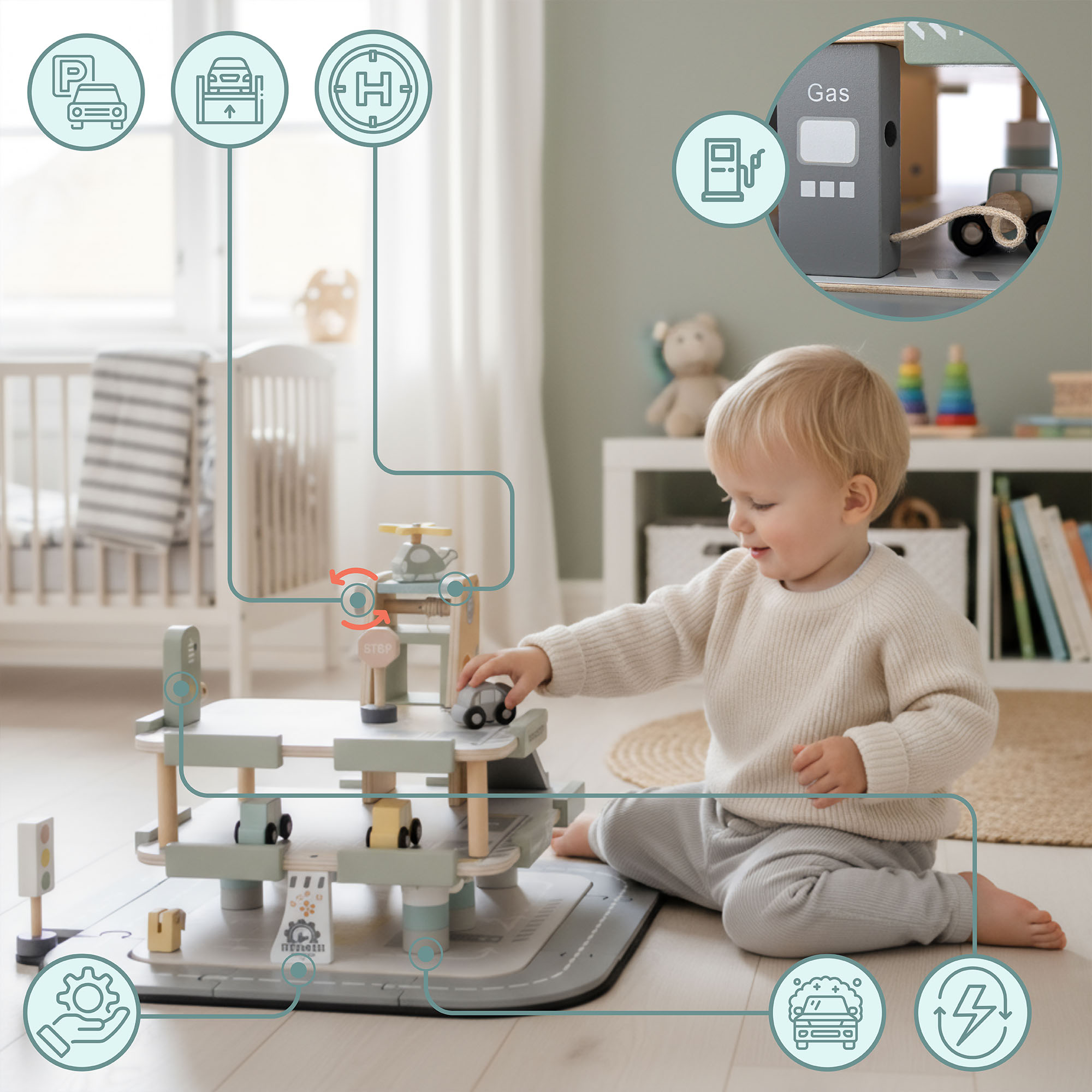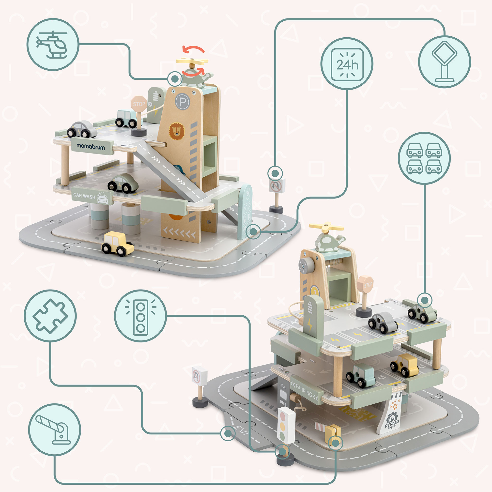 Schenken Sie Ihrem Kleinen sein eigenes Autozentrum! Die dreistöckige Mamabrum-Garage aus Holz ist nicht nur ein Parkplatz , sondern verfügt auch über eine Tankstelle, eine Autowaschanlage, eine Werkstatt, eine Ladestation für Elektroautos, eine mobile Hebebühne und einen Helikopterlandeplatz . Mit einer großen Auswahl an Zubehör können Kinder unzählige Spielszenarien schaffen – von alltäglichen Fahrten bis hin zu aufregenden Stadtabenteuern.