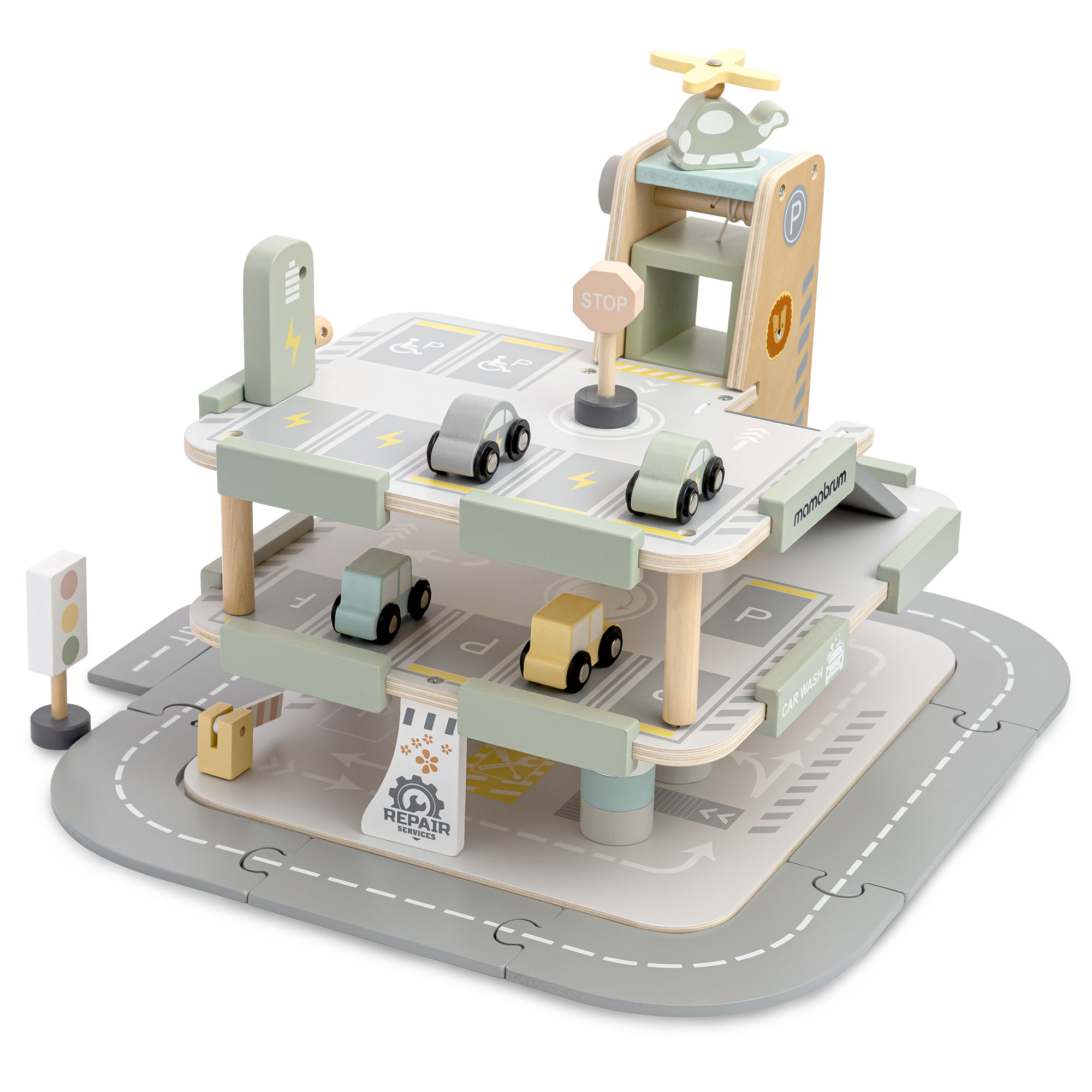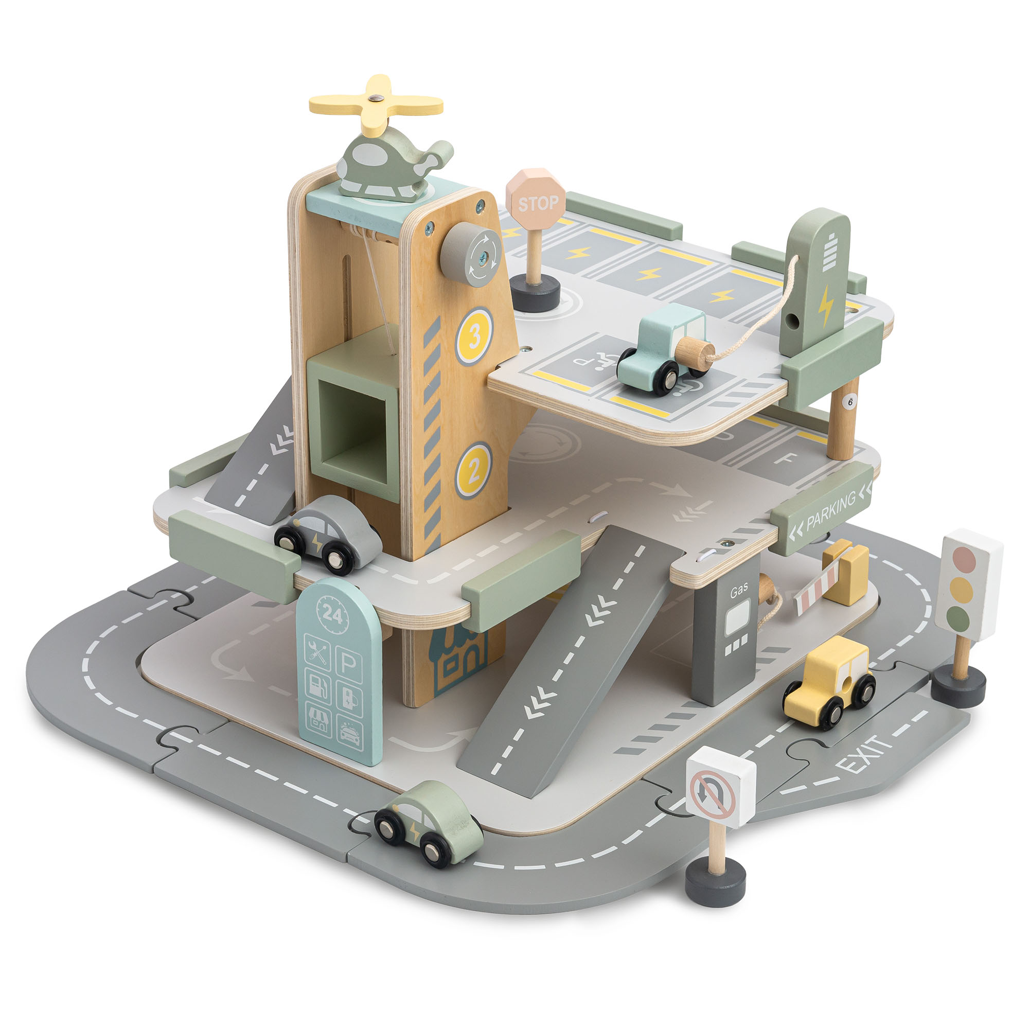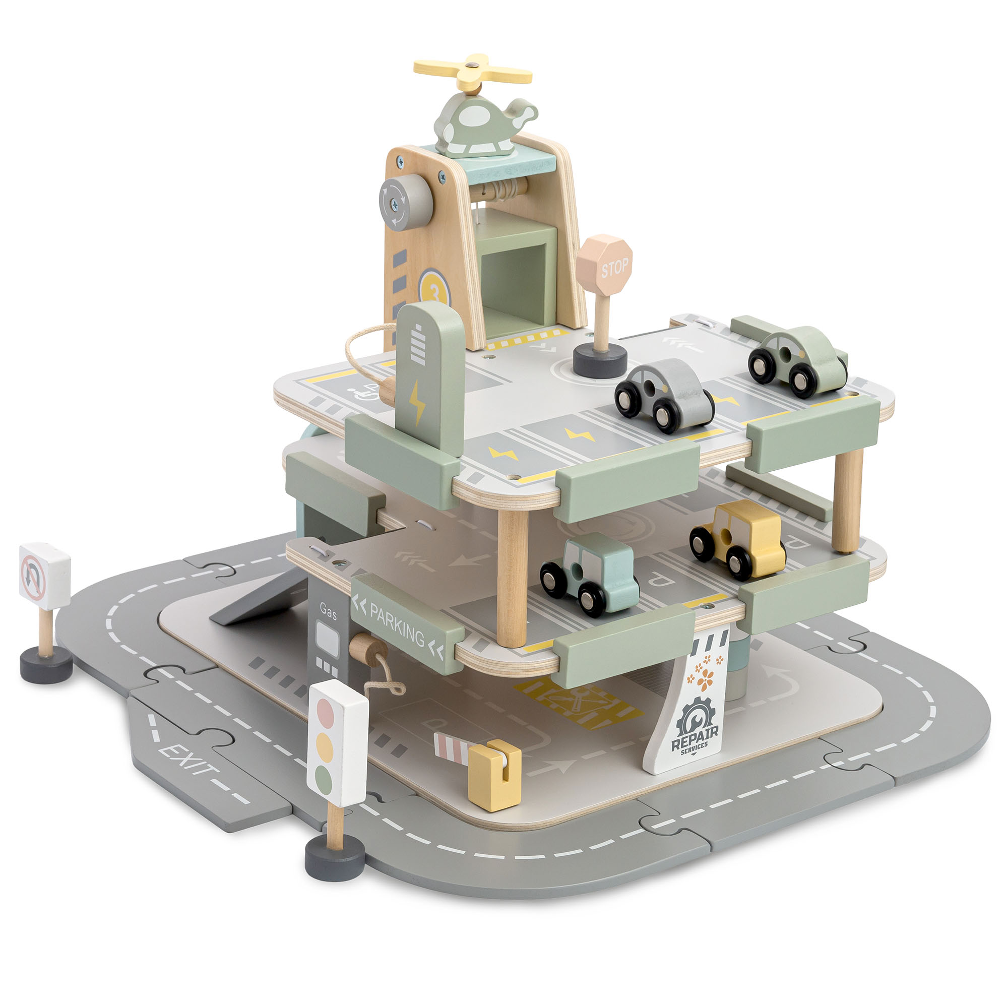 Dreistöckige Holzgarage für Kinder mit Zubehör – Parkplatz, Tankstelle, Autowaschanlage, Hubschrauber