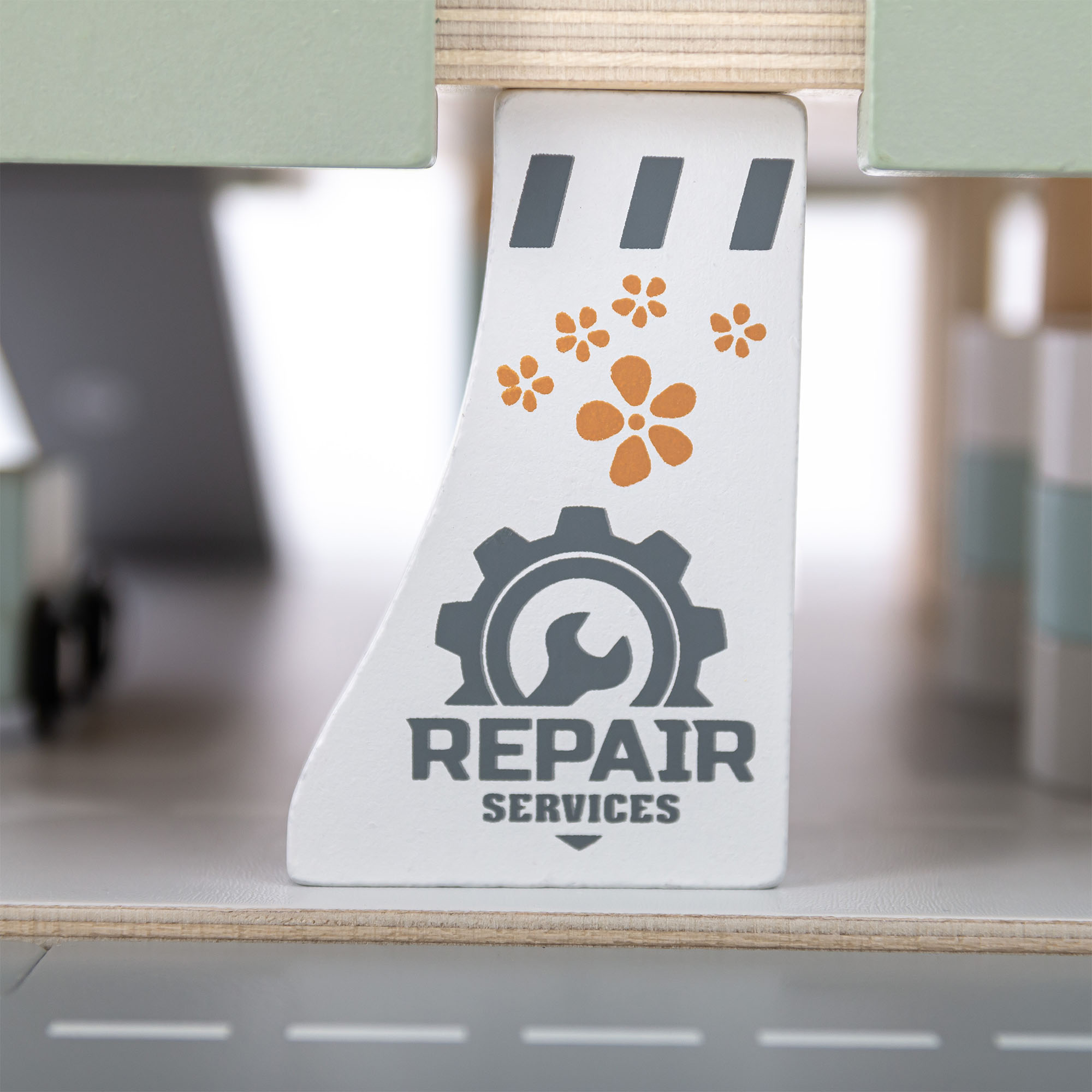 - Zahlreiche bewegliche Elemente – eine Hebebühne, Autowaschrollen, eine Schranke, ein rotierender Hubschrauberpropeller und Autoräder, ein beweglicher Schlauch der Tankstelle und eine Ladestation für Elektroautos, Straßenrätsel, die Straßen rund um den Parkplatz bilden.