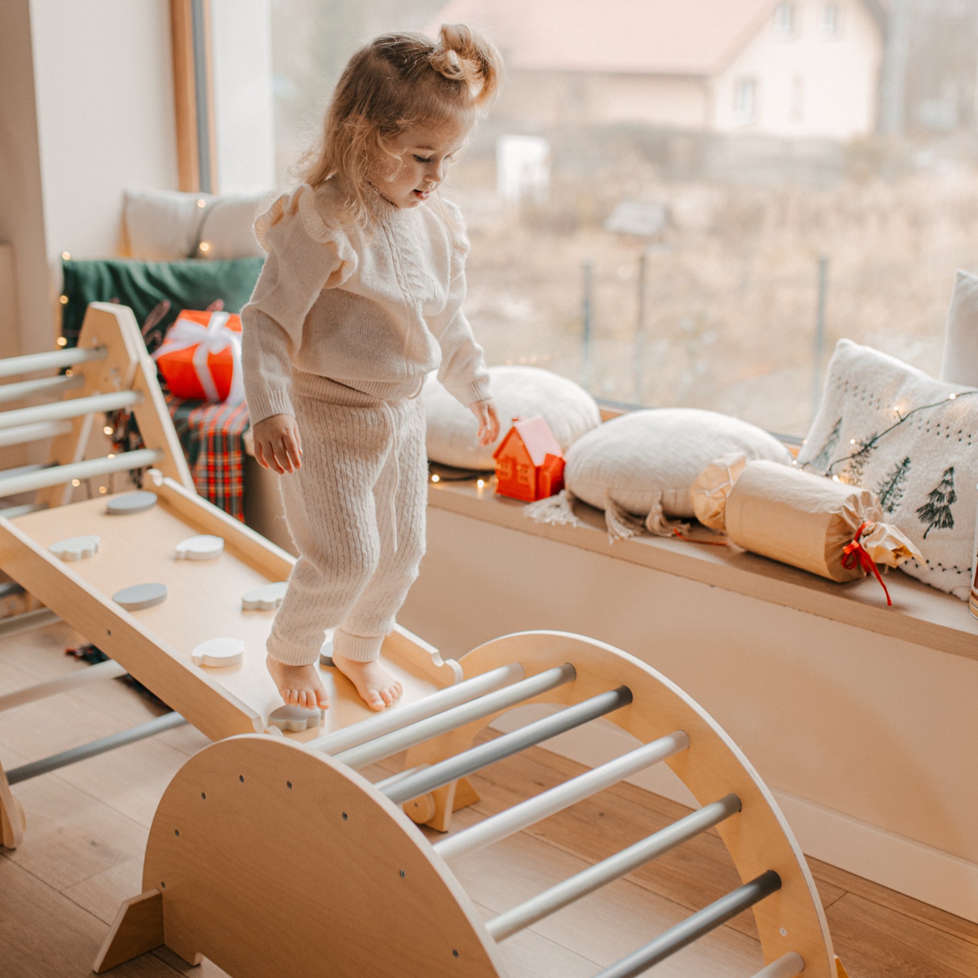 Der Bogen lädt zum Klettern, Balancieren und Hindernisparcours ein . Drehen Sie den Bogen einfach um und legen Sie ein Kissen oder eine Decke hinein, um einen sicheren Schaukelstuhl zu schaffen – perfekt für ruhiges und entspannendes Spielen. Der Bogen kann auch als Tisch verwendet werden – ideal zum Malen, Bauklötzen oder Lesen.