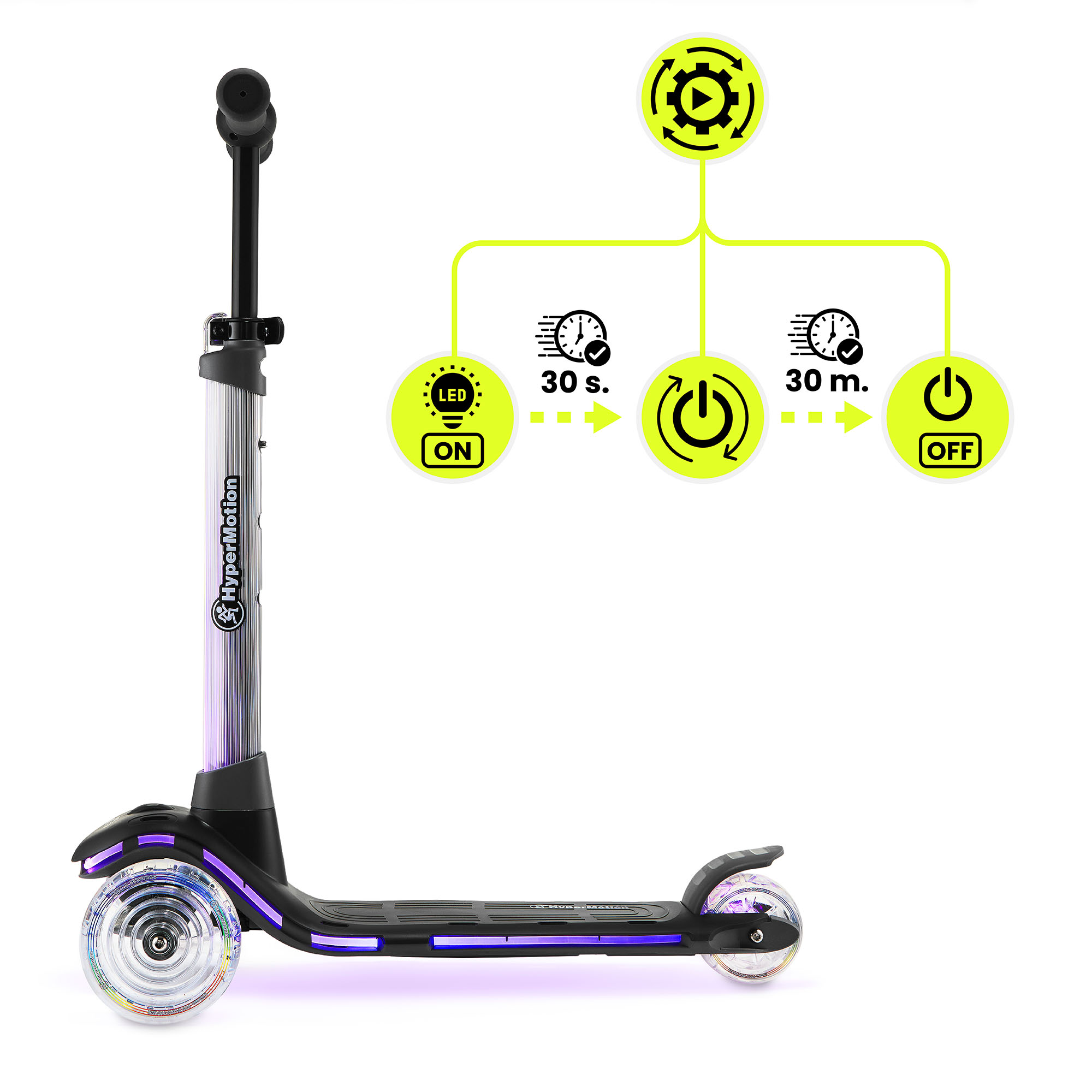 Dank der auffälligen LED-Beleuchtung am Lenker und an beiden Seiten des Trittbretts zieht der Scooter sofort alle Blicke auf sich. Die Lichter tauchen das Fahrzeug in ein magisches Licht und machen jede Fahrt zu einem farbenfrohen Abenteuer voller Energie und Freude. Doch es ist nicht nur ein schöner optischer Effekt – die Beleuchtung erhöht auch die Sichtbarkeit des Kindes und sorgt so für mehr Sicherheit beim Spielen im Freien .