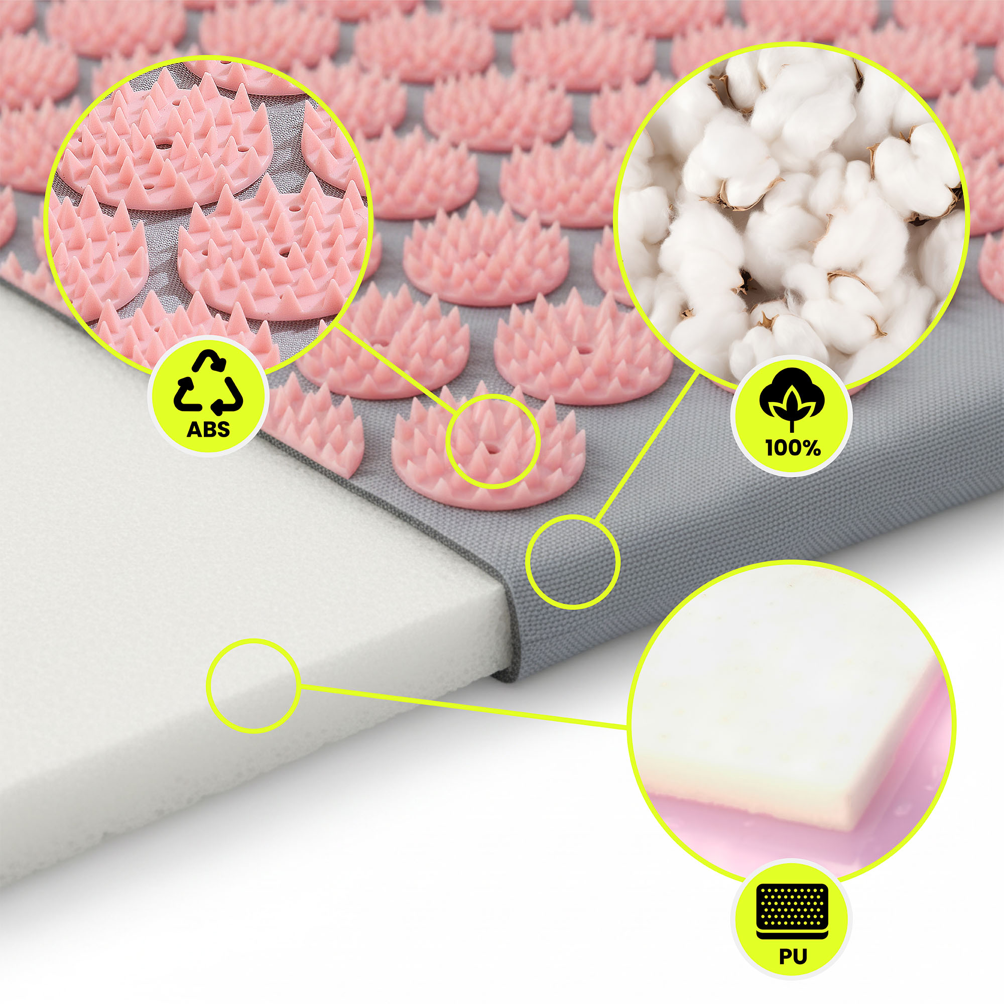 Jedes Element des Sets wurde mit Blick auf Komfort und den täglichen Gebrauch entwickelt. Die Bezüge von Matte und Kissen bestehen aus 100 % natürlicher Baumwolle , die sich weich anfühlt und angenehm auf der Haut liegt. Die Füllung aus flexiblem Schaumstoff sorgt für stabilen Halt . Die robusten Kunststoffnoppen mit ihren abgerundeten Spitzen bieten eine sanfte, aber spürbare Stimulation. Eine leichte, abriebfeste Nylontasche rundet das Set ab.