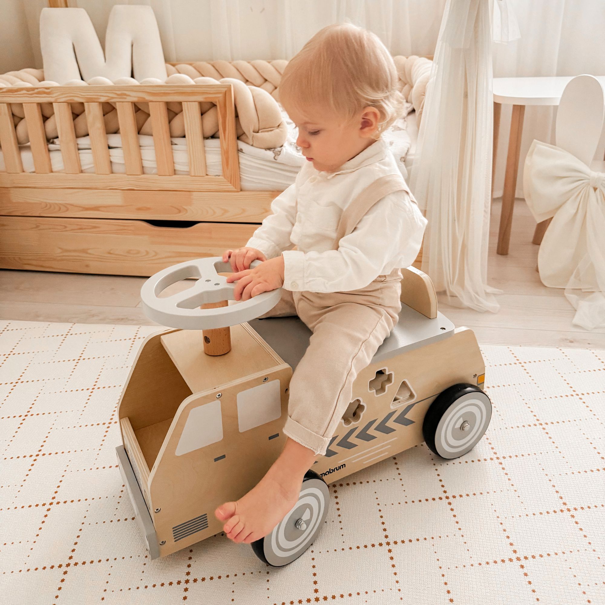 Das Auto besticht durch ein schönes, skandinavisches Design. Es wurde in dezenten Farben bemalt, die die natürliche Farbe der Materialien betonen. Die Räder des Spielzeugs sind mit einem speziellen Anti-Rutsch-Gummi gesichert, das ein Verkratzen der Oberfläche verhindert.