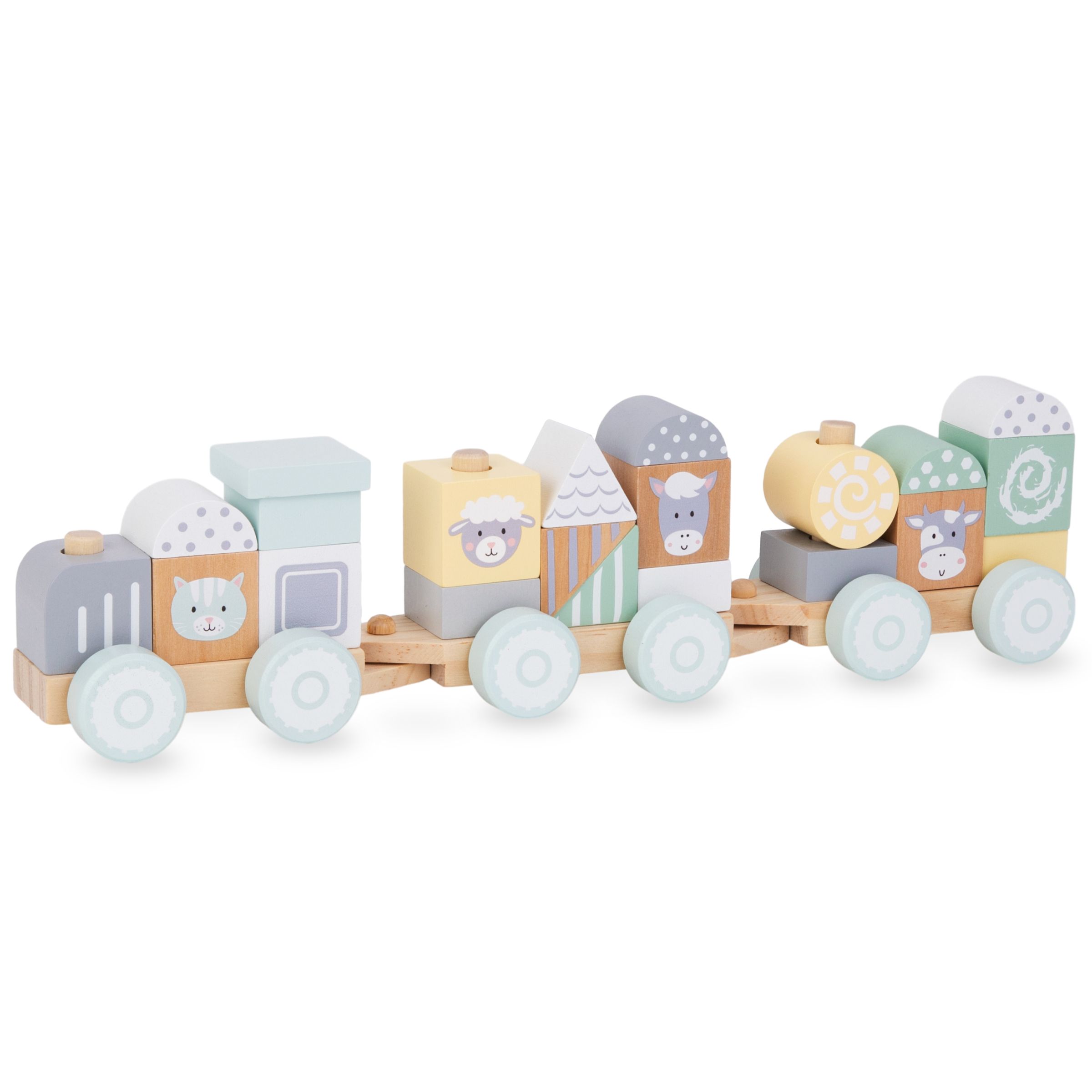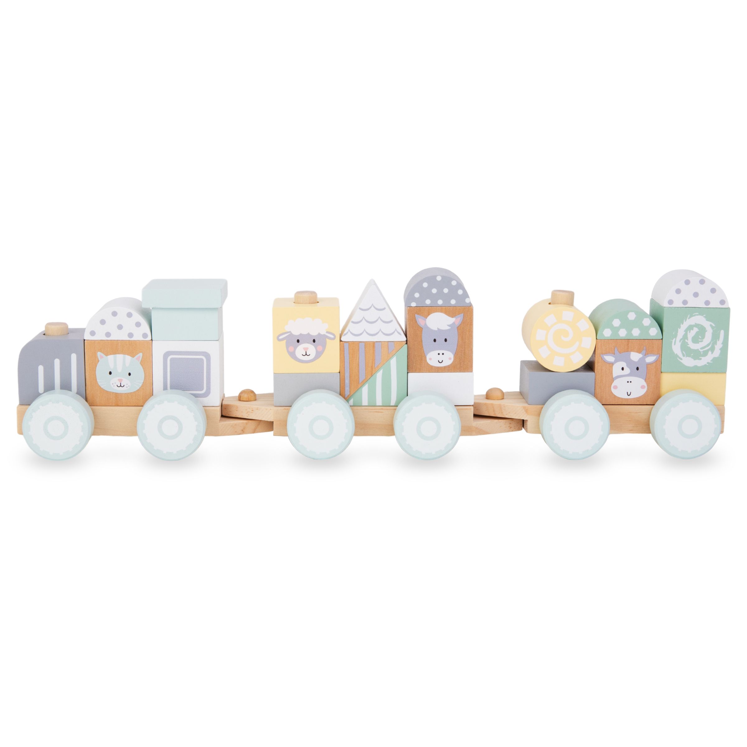 Die hölzernen, mit Rädern versehenen Waggons können zu einer einzigartigen Lokomotive zusammengefügt werden. Durch Aufstecken der bunten Blöcke auf die speziellen Stifte baut das Kind eine einzigartige Zugkonstruktion. So kann der Zug jedes Mal anders aussehen! Wenn alles fertig ist, ist es Zeit für eine Fahrt. Während der Fahrt kann Ihr Kind die Waggons abnehmen oder die Position der Blöcke verändern. Um das Spiel abwechslungsreich zu gestalten, enthält das Set Bausteine mit dem Bild von niedlichen Bauernhoftieren .